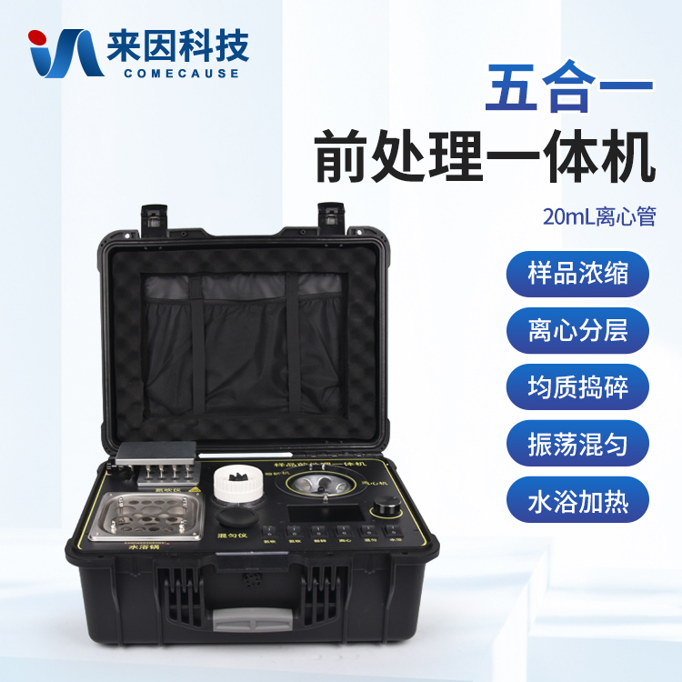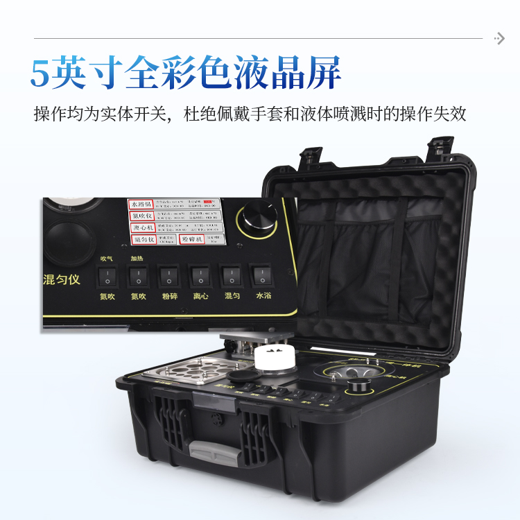 简要描述: 五合一前处理一体机功能紧凑,集成五种样品前处理常用的功能,完成样品一站式处理。结构稳固,机箱采用高品质工程塑料,具备优秀的抗冲击性、耐腐蚀性、便携性。操作稳定,机器采用五寸全彩色液晶屏,功能指示性强,用户操作均为实体开关,杜绝佩戴手套和液体喷溅时的操作失效。