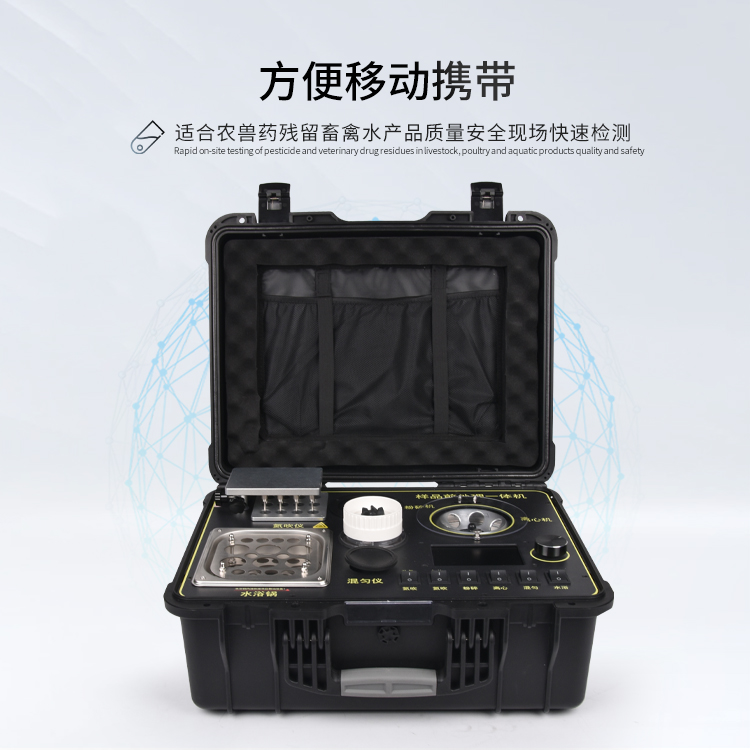 应国内用户的实际需求,自行研制开发的新型仪器——QC05型样品前处理一体机。样品前处理集成箱将样本前处理过程中样品浓缩、水浴恒温、离心分层、均质、振荡混匀等步骤所需设备进行集成,仅需一台样品前处理集成箱设备即可完成所有样本前处理过程,并且方便携带,不仅适用于现场检测使用,还可用于色谱、质谱等分析样品的纯化和制备。